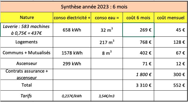 L'ensemble : Laverie + espaces mutualisés + communs + Ascenseur & Assurance   Pour ceux qui sont impatients : aller voir la dernière colonne. Par exemple le coût des espaces mutualisés revient en moyenne à 13€ par an pour chaque foyer. Laverie Espaces mutualisés Communs Ascenseur & assurance